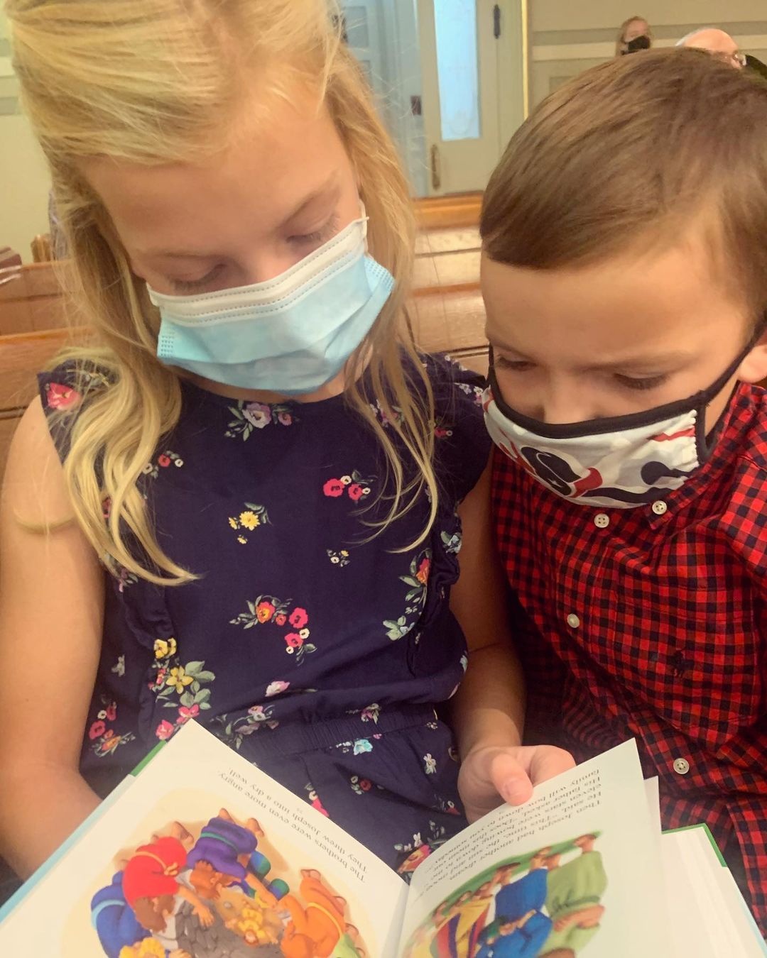 Will, a Kindergartener, and his sister reading the Beginner’s Bible together in church after receiving it.